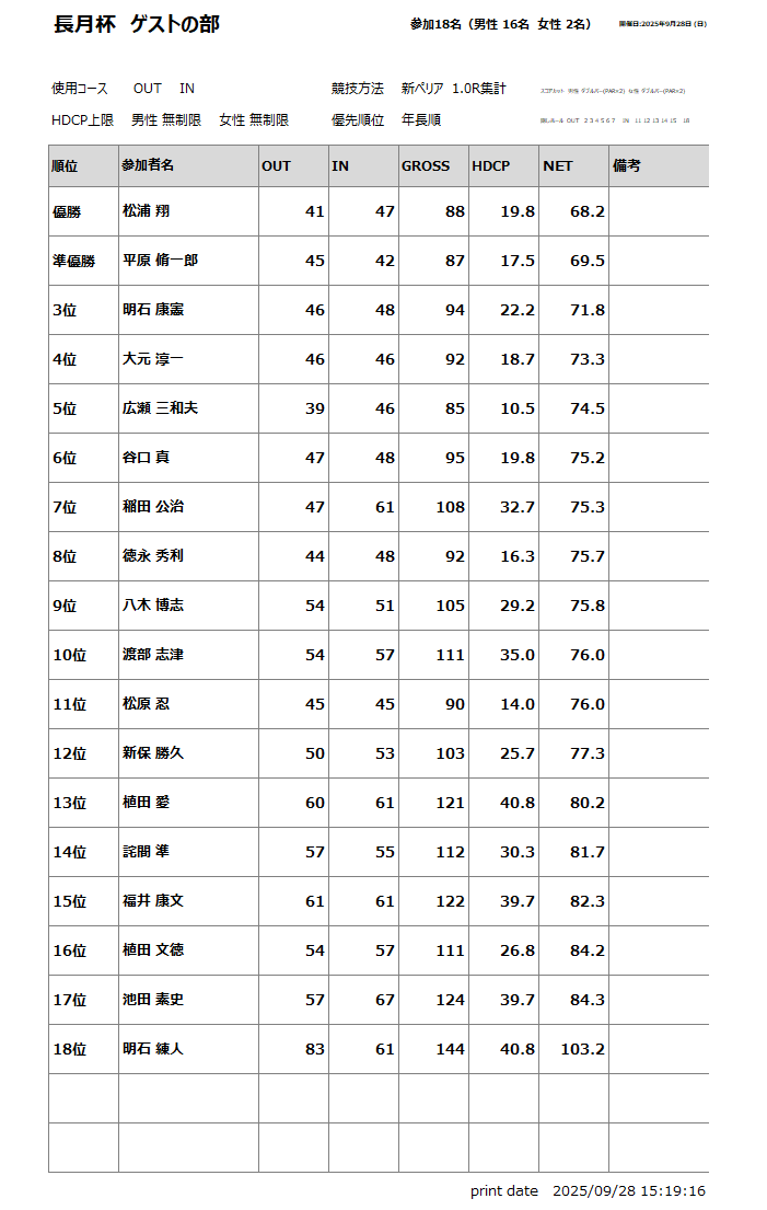 2025年9月28日(日)に行われた長月杯・ゲストの部の成績をUPします。