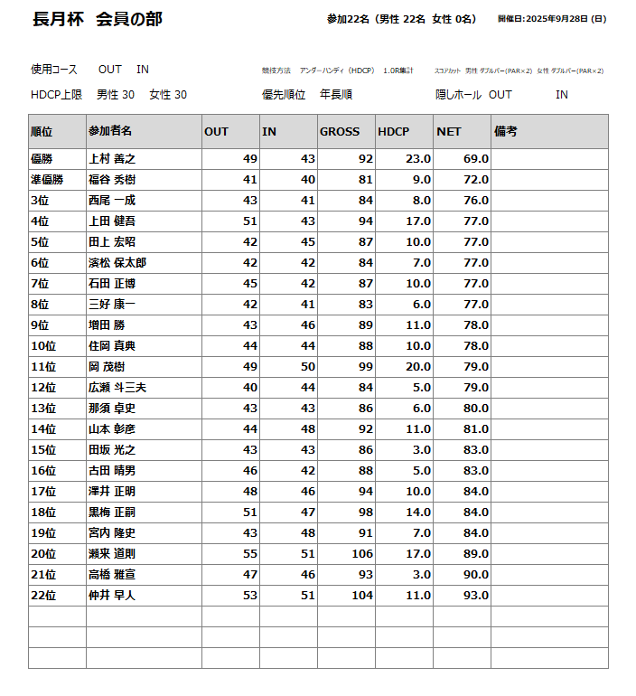 2025年9月28日(日)に行われた長月杯・会員の部の成績をUPします。