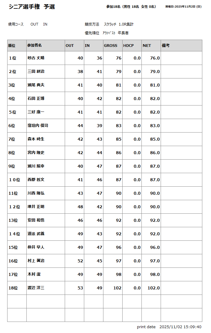 2025年11月2日(日)に行われたシニア選手権 予選の成績をUPします。