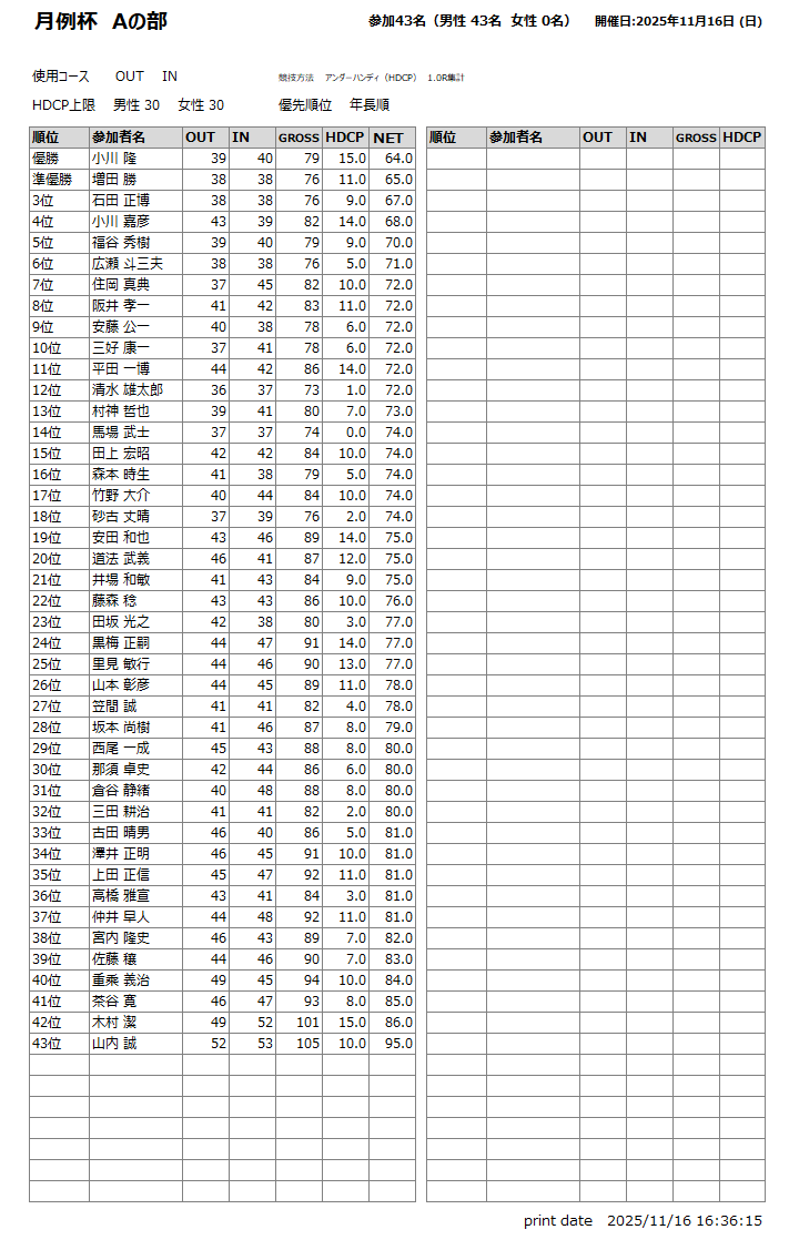 2025年11月16日(日)に行われた月例杯・Aの部 成績をUPします。
