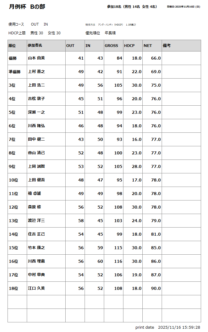 2025年11月16日(日)に行われた月例杯・Bの部 成績をUPします。