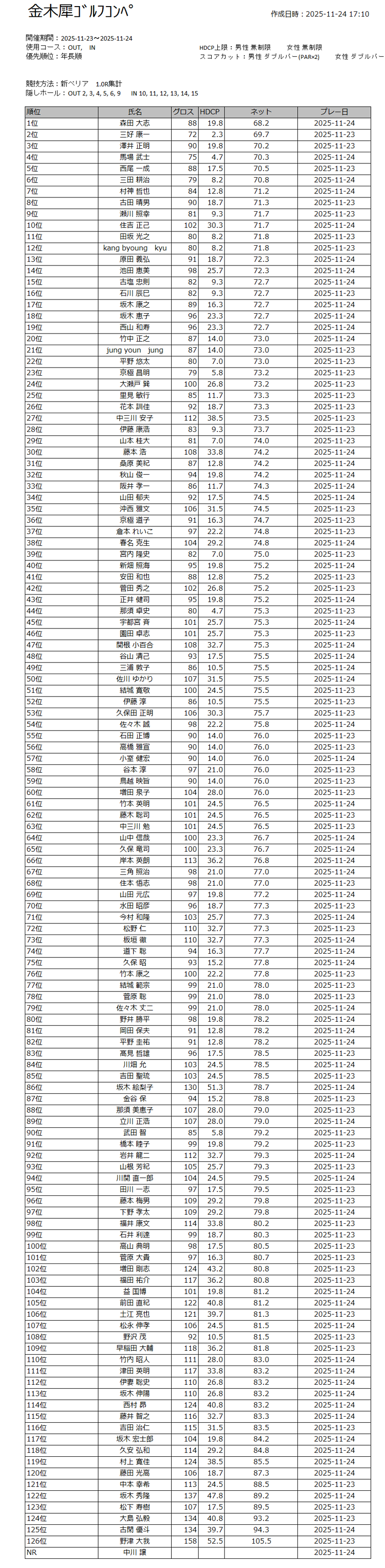 2025年11月23・24日(日・月祝)に行われた金木犀ゴルフコンペの成績をUPし