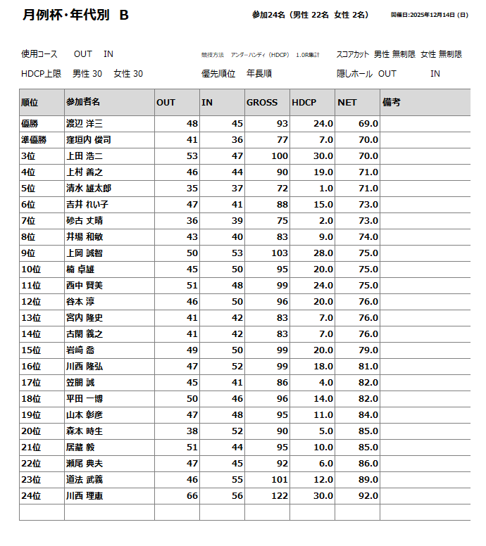 2025年12月14日(日)に行われた月例杯・Bの部 成績をUPします。