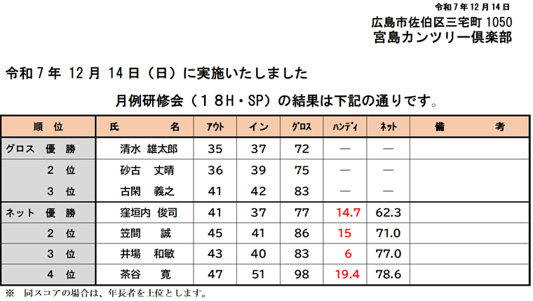 2025年12月14日(日)に行われた月例研修会の成績をUPします。
