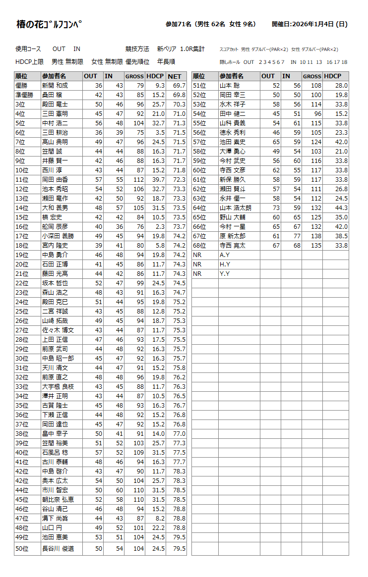 2026年1月4日(日)に行われた椿の花ゴルフコンペの成績をUPします。