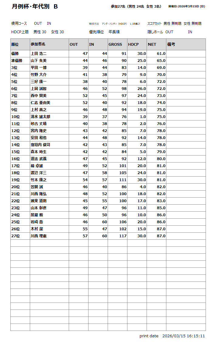 2026年3月15日(日)に行われた月例杯・年代別Bの部の成績をUPします。