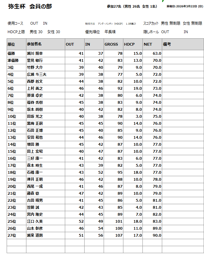 2026年3月22日(日)に行われた弥生杯・会員の部の成績をUPします。
