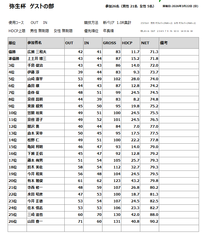 3月 弥生杯・ゲストの部 2026年3月22日(日)に行われた弥生杯・ゲストの部の成績をUPします。入賞者の方は優勝・準優勝・三位の方々です。おめでとうございます🎉 投稿日 2026/03/22 (日)
