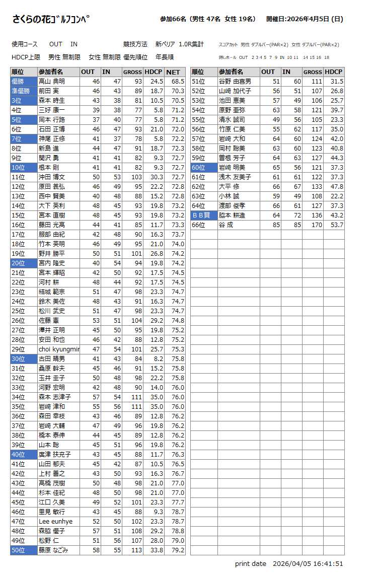 4月 さくらの花ゴルフコンペ🌸 2026年4月5日(日)に行われたさくらの花ゴルフコンペの成績をUPします。本日、さくら満開🌸3Hでのプレイはいかがだったでしょうか。入賞者の皆様、おめでとうございます🎉 投稿日 2026/04/05 (日)