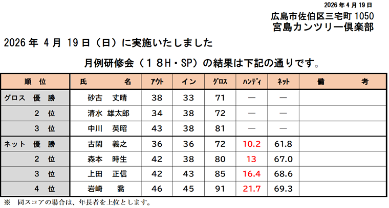 2026年4月19日(日)に行われた月例研修会の成績をUPします。