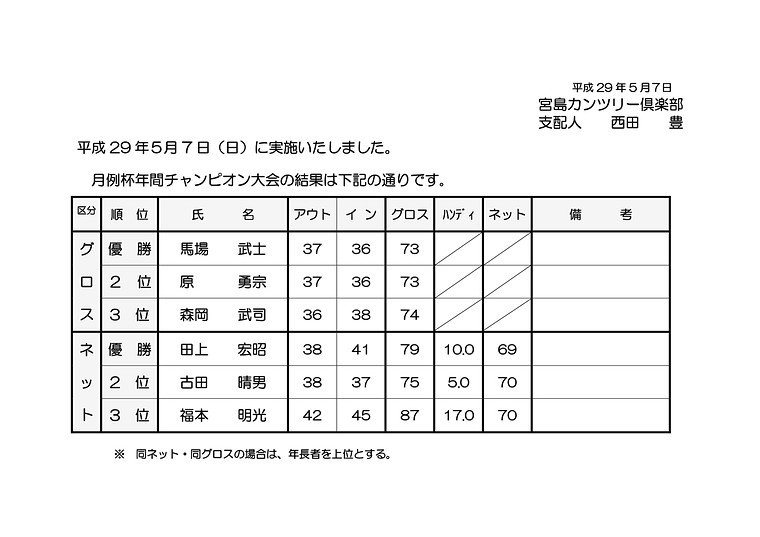 5/7開催【月例杯年間チャンピオン大会】入賞者
